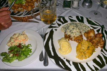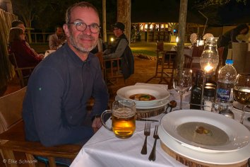 Bei Vorspeise und Dessert können wir jeweils zwischen zwei Varianten wählen und den Hauptgang gibt es in Buffet-Form. Alles ist sehr sehr lecker, aber ich merke immer mehr, dass ich in den letzten Wochen viel zu viel Fleisch gegessen habe — ich kann es irgendwie gar nicht mehr sehen. Deshalb halte ich mich heute nur an Fisch und Gemüse und bin damit sehr zufrieden. Andreas dagegen hat das Fleisch noch nicht über und vertilgt ein Riesen Stück Kudu.