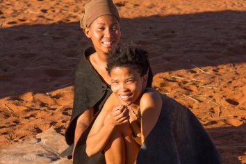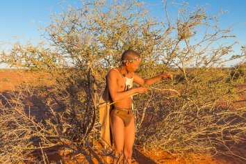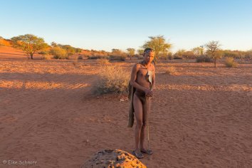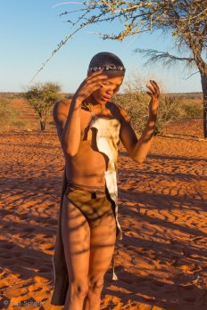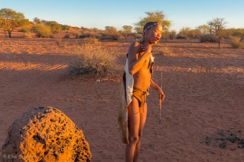Obwohl es zu der frühen Stunde noch sehr frisch ist, ist der Bushman nur mit Lendenschurz bekleidet — mich fröstelt schon beim Hinschauen…