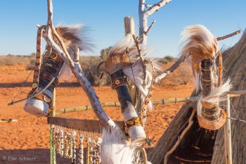 Im San Dorf angekommen, wird uns noch ein letzter Brauch — die Liebespfeile — erklärt, bevor wir Fotos machen und etwas von dem traditionellen Schmuck kaufen können: