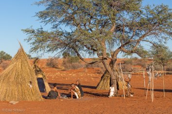Pünktlich um 7:30 treffen wir uns dann an der Rezeption. Außer uns ist nur noch eine andere Reisende dabei und so brechen wir kurze Zeit später zu fünft zu dem nachgestellten San Dorf auf: wir drei Touris, ein Bushman und ein Übersetzer.