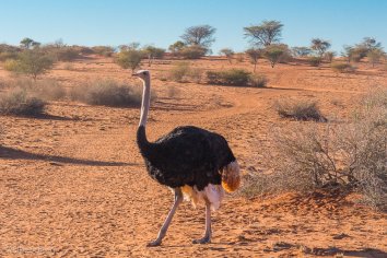 Unser Guide meint, das sei ein Anzeichen dafür, dass er gerade sehr angriffslustig sei und er ordert per Funk ein Auto der Lodge herbei, was den Strauß vertreiben soll.