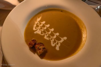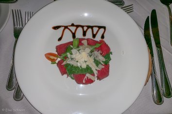 Zurück in der Lodge gehen wir direkt zum Abendessen. Die Vorspeisen sind wieder superlecker, aber beim Hauptgang am Buffet halten wir uns heute ein wenig mehr zurück, da wir schon mit Schrecken daran denken, was für vorwurfsvolle Blicke uns die Waage zu Hause zuwerfen wird…
