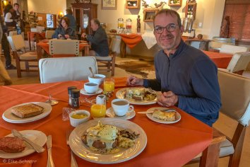 Obwohl heute kein Sonntag ist, können wir die Angestellten überreden, uns das „Sunday’s Special“ von der Frühstückskarte zu servieren — sozusagen als kleines Trostpflaster für uns, weil wir heute wieder nach Hause fliegen müssen