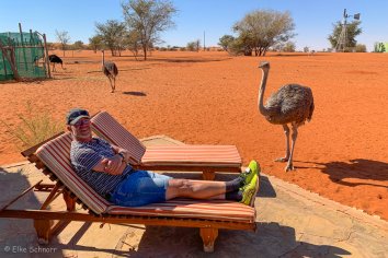 Nach einem letzten Dünenspaziergang setzen wir uns an den Pool, beobachten das Wildlife, was immer wieder hier vorbei kommt und genießen die letzten wunderbaren sonnendurchfluteten Anblicke von rotem Sand und tiefblauem Himmel.