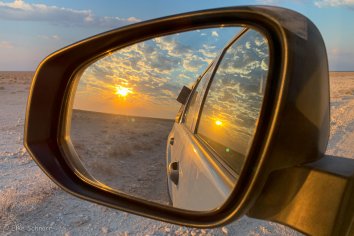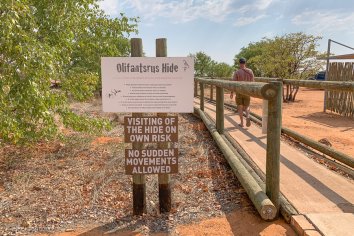 Das frühe Aufstehen wird zur Routine: Als der Wecker um 5:30 Uhr klingelt, sind wir schon lange munter. Wir packen unsere Sachen zusammen und räumen das Auto abfahrtbereit ein. Dann schauen wir gleich noch einmal beim Wasserloch vorbei. Dort stehen zwar bereits erstaunlich viele Leute herum, aber leider ist kein Tier zu sehen.