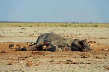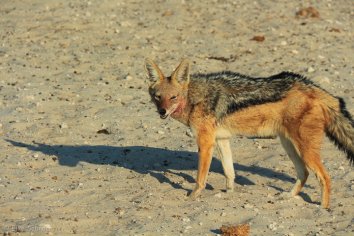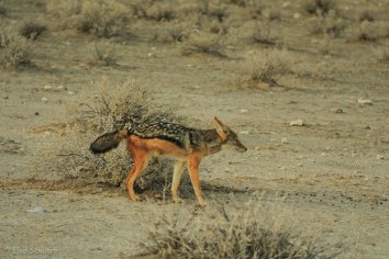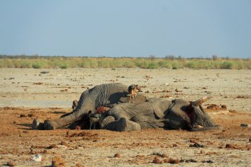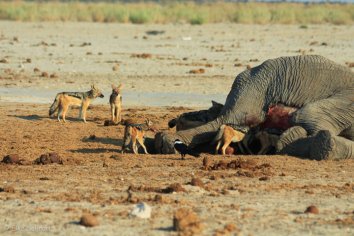 Als wir dann aber zum ersten Wasserloch Ozonjuitji kommen, herrscht Highlife: Ein Elefant hat direkt neben dem Wasserloch das Zeitliche gesegnet und die Aasfresser haben angefangen, sich über ihn herzumachen. Es wimmelt von Schakalen, die hier ein wahres Festmahl vorfinden.
