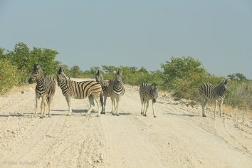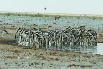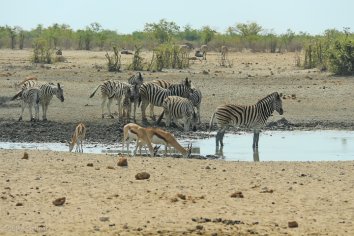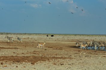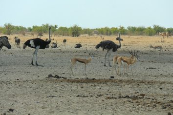 Am Tobieroen Wasserloch unterbrechen wir das Geholper und finden eine friedvolle Eintracht vor: Zebras, Springböcke, Kudus und Strauße. Naja — friedlich bis auf eine gelegentlich kurze Straußenjagd durch ein paar übermütige Zebras.