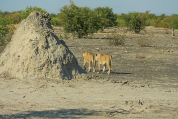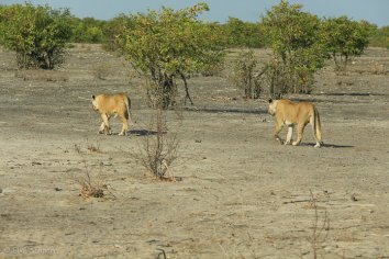 Wir fahren weiter zum nächsten Wasserloch. Dort gibt es zwar nicht viel zu sehen, aber dafür spazieren kurz danach zwei Löwendamen vor uns über die Straße.
