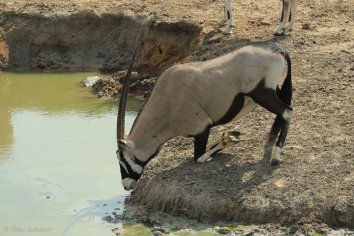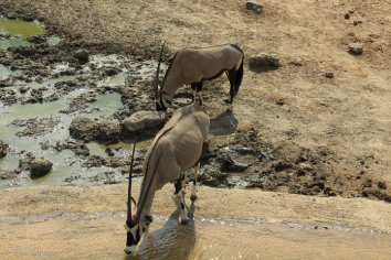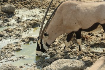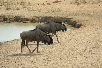 Gegen Mittag kommen wir in Olifantsrus an. Hier auf dem Camp gibt es einen schönen Hide am Wasserloch, wo wir uns eine Weile von unserer „African Massage“ erholen und die Gnus und Oryxe beobachten, die sich im Wechsel die Rechte am Wasserloch streitig machen.