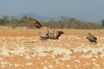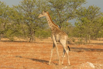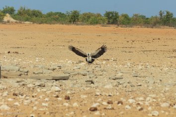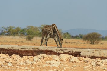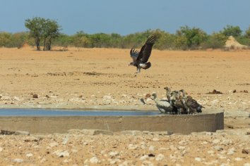Wir sind froh, als wir am Nomab Wasserloch ankommen und wieder kurz verschnaufen können. Hier scheint es eine Versammlung der Geier zu geben. Anfangs sind es nur drei, aber dann kommen ständig neue angeflogen und reihen sich mit auf dem Rand des Wasserloches ein. Wir zählen mindestens 20 Geier und ein paar Giraffen.