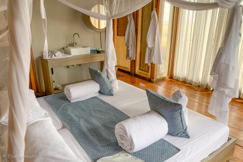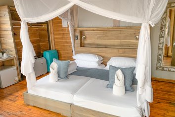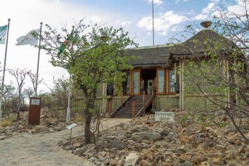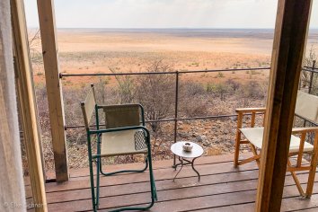 Wir bekommen das Chalet Nummer 11, von dem man leider nur einen recht eingeschränkten Blick auf’s Wasserloch hat. Aber es ist trotzdem ganz nett und und natürlich traumhaft gelegen — wir hatten auf der Anfahrt schon die Häuschen am Hang gesehen und gerätselt, welches wohl unseres sein wird.