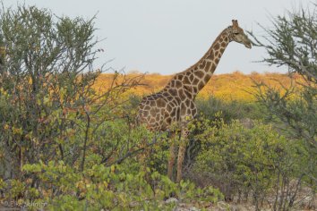 Der westliche Teil des Etosha Parks zeigt sich auch heute wieder recht frei von Wildlife — einzig eine einsame Giraffe können wir irgendwann am Wegesrand entdecken.
