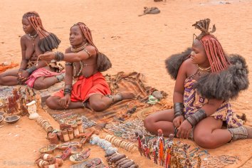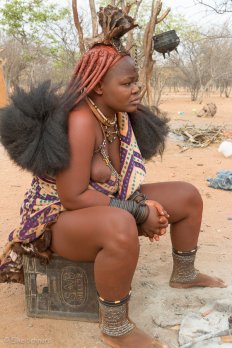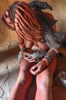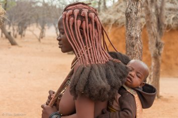 Die aufwendige Haarpracht der Himbafrauen muss etwa alle drei Monate erneuert werden - die Farbe wird dann ausgewaschen und neu aufgesetzt. Eine der Frauen ist gerade in dieser „Erneuerungsphase“ — ihre Haaren haben nicht den typischen Rotton.