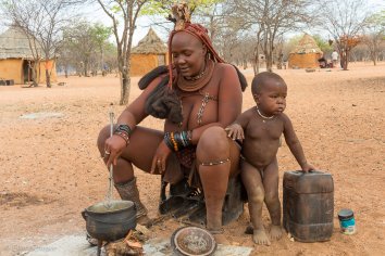 Die Himba sind einer der letzten Stämme in Afrika, die im Norden Namibias als nomadisierende Viehzüchter, Jäger und Sammler noch streng nach ihrer alten Tradition leben.