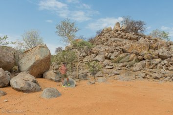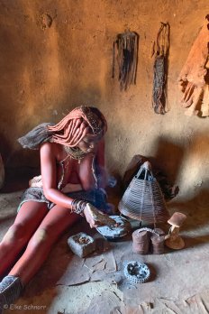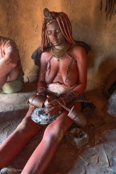 In die Hütten der Bewohner gehen wir nicht, aber die „Schmink-Hütte“ wird uns gezeigt. Hier werden aus Rotsteinpulver und Butterfett die Farben zusammengerührt, mit denen sich die Himbas ihre Haut und ihre Haare einschmieren. Außerdem werden in dieser Hütte Körper und Bekleidung ausgeräuchert, um Ungeziefer zu bekämpfen — für die Himbas der Ersatz für‘s Waschen. Bei der hier permanent vorherrschenden Wasserknappheit eine durchaus praktische Lösung.
