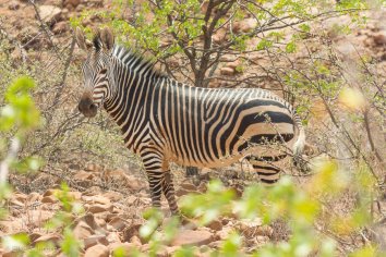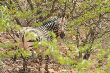 … und sehen kurz danach direkt neben der Straße ein paar Zebras. Diesmal sind es allerdings keine Steppenzebras wie im Etosha Park sondern die eher selteneren Hartmann Mountain Zebras: sehr gut zu erkennen an den fehlenden Schatten zwischen den einzelnen Streifen.
