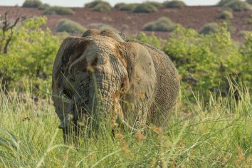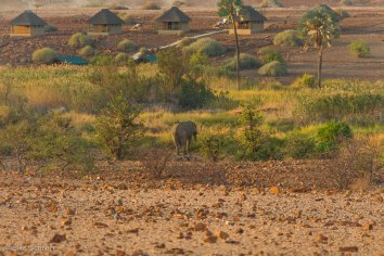 Unser Walk beginnt hinter der Lodge, wo wir als erstes das Flussbett überqueren müssten. Das funktioniert schon mal nicht, denn ein großer Wüstenelefant versperrt uns den Weg. Und da mit diesen Dickhäutern in der Regel nicht zu spaßen ist, machen wir lieber einen großen Bogen um ihn.