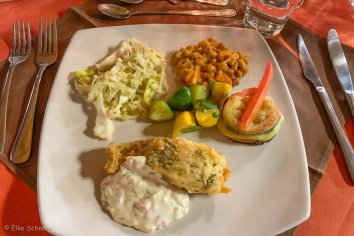 Wir nehmen noch einen Sundowner an der Pool-Bar, chillen eine Runde auf unserem Balkon und gehen um 19:00 Uhr zum Dinner. Es gibt mal wieder Bufett und diesmal ist zur Abwechslung sogar Fisch dabei. Das Angebot ist reichlich und sehr gut, wir sind rundum zufrieden.