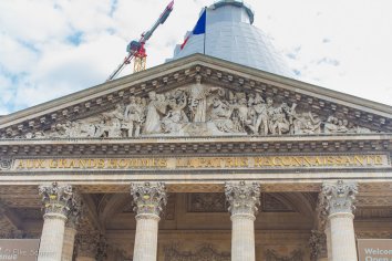 Vom Jardin du Luxembourg aus ist es nur ein kurzer Abstecher zum Panthéon und so stehen wir recht bald vor der monumentalen Säulenhalle mit den goldenen Lettern auf dem Giebeldreieck „Au Grands Hommes — La Patrie Reconnaissante“.