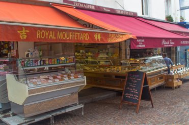 So biegen wir nach ein paar Querstraßen in die Rue Moffetard ein — eine krumme, enge Marktstraße, die bekannt ist für die vielen Stände und Läden, an denen vom Käse bis zu Früchten der Saison alles angeboten wird, was Frankreich an kulinarischen Genüssen zu bieten hat.