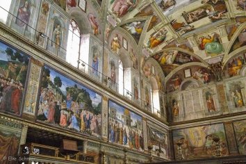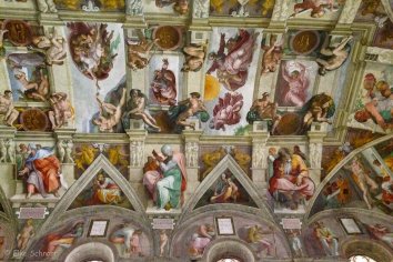 Wir suchen uns einen Platz, an dem wir nicht ganz so arg bedrängt werden und schauen uns in der Kapelle um. An dem berühmteten Deckengemälde, das die Erschaffung der Welt darstellen soll, hat Michelangelo vier Jahre lang gearbeitet und ihm ist wahrlich ein Meisterwerk gelungen: