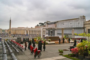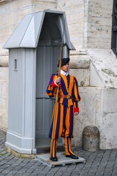 Auf dem Petersplatz ist unsere Führung dann offiziell beendet. Wir schauen noch ein wenig bei den Vorbereitungen für das morgige Urbi et Orbi zu und machen das obligatorische Foto von der Schweizergarde. Die Soldaten aus dem Alpenstaat sind seit 500 Jahren die Wächter des Papstes und des Vatikans. Ihre Uniformen mit der blau-gelb gestreiften Kniehose sollen angeblich von Michelangelo entworfen worden sein.