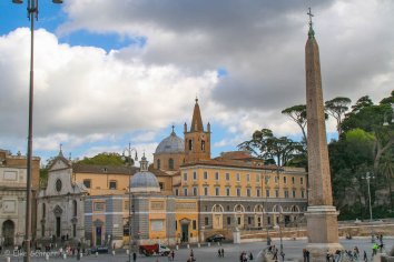 Dabei kommen wir zunächst über die Piazza del Popolo — den „Platz des Volkes“, der mit seinen vielen Motiven die Kameras der Besucher glühen lässt. Im Zentrum steht der Obelisk Flaminio: ein etwa 3300 Jahre altes Souvenir, das Kaiser Augustus einst aus Ägypten mitbrachte und zunächst auf dem Circus Maximus aufstellte. Erst im 16. Jahrhundert ließ ihn Sixtux V. hier neu errichten.