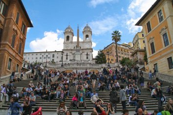 An der Spanischen Treppe herrscht reges Treiben — massenhaft Leute bevölkern die Stufen und kaum ein freies Plätzchen ist zu finden. Es ist nicht zu übersehen, dass hier ein beliebter Treffpunkt von Römern und Touristen ist. Wir machen ein paar obligatorische Fotos, verziehen uns dann aber recht bald in eine ruhige Seitengasse, denn unsere Mägen vermelden, dass es Mittagszeit ist.