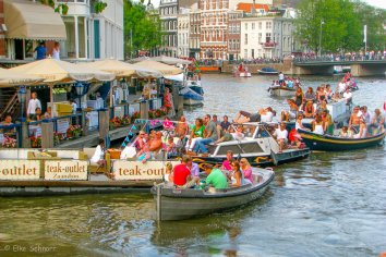 Später geht es dann weiter nach Amsterdam, wo wir gegen 17:00 Uhr im Marriot einchecken. Während wir uns anfangs noch über den Mangel an Parkplätzen wundern — nicht mal im Hotelparkhaus ist etwas frei — und über die vielen etwas seltsamen Gestalten, wird uns die Ursache bald klar: In Amsterdam findet ausgerechnet heute die jährliche „Gey-Parade“ statt und in den Straßen und Kanälen herrscht quasi Ausnahmezustand.