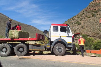 Ein Laster hat wohl eine Kurve mit zuviel Schwung genommen und dabei seine ganze Ladung Strohballen verloren, die nun überall auf der Straße verteilt sind und erstmal wieder eingesammelt werden müssen.