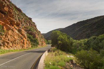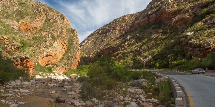 Für den Rückweg nach Oudtshoorn fahren wir nun die alternative Strecke durch die Meiringspoort — eine Schlucht, die vor allem durch die bizarr geformten Sandsteinformationen und die roten Klippen bekannt ist.