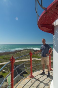 Am Leuchtturm von Cape Agulhas halten wir noch einmal an, da dieser gestern ja schon geschlossen war. Über sehr steile Holzleitern klettern wir 70 Stufen nach oben und müssen dort wegen des starken Windes unsere Brillen gut festhalten.