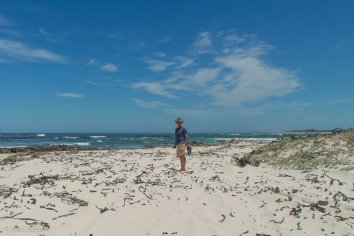 Hier am Strand gibt es überhaupt keine Quallen oder Schnecken, dafür aber Unmengen von angespülten Algen. Leider ist aber das Meer zu aufgewühlt, um irgendwelche Wale entdecken zu können.