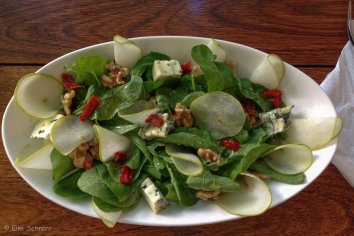 So sitzen wir also relativ spät zusammen mit den anderen Gästen auf der Terrasse und genießen total entspannt ein wunderbares Frühstück, den fantastischen Ausblick vom Garten auf die umliegenden Berge und Annettes sehr speziellen Humor.