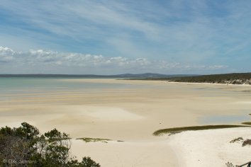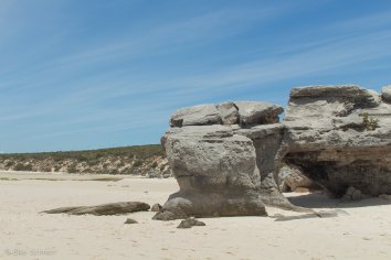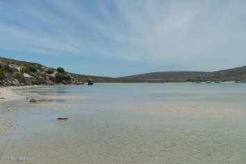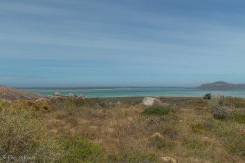 Schließlich waten wir bei Kraalbaai noch im lauwarmen türkisfarbenen Wasser der Lagune herum. Das Wasser ist glasklar — Ursache dafür sind wohl Muschelkolonien, deren Bewohner das Wasser filtern und die mikroskopisch kleinen Partikel zurückhalten.