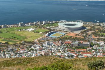 Und wo wir einmal hier sind, fahren wir auch gleich noch das kurze Stück bis zum Viewpoint am Signal Hill. Auch von hier hat man nochmal tolle Aussichten — auf Bo Kaap und das WM Stadion, auf den Lions Head, den wir gerade erklommen haben und und sogar eine gerahmte Sicht auf den Tafelberg
