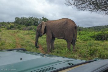 Nach zwei Stunden Fahrt kommen wir gegen 15:00 Uhr im Addo Elephant Park an und checken direkt ein. Wir haben ein Rondavel mit Blick auf’s Wasserloch reserviert und inspizieren dieses erst einmal gründlich.