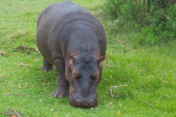 Am Rande eines Wasserlochs entdecken wir einen kleinen Hippo, der genüsslich schmatzend im Gras herumwatschelt.