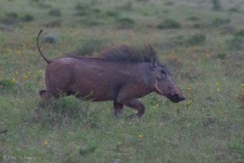Es ist schon dämmrig und zum Fotografieren nicht mehr so dolle, aber unsere „Ausbeute“ ist auch im eigenen Auto und ohne Guide gar nicht mal so schlecht: In den 90 Minuten, die wir noch unterwegs sind, sehen wir Elefanten, Warzenschweine, Zebras, Kudus und ein paar Perlhühner.
