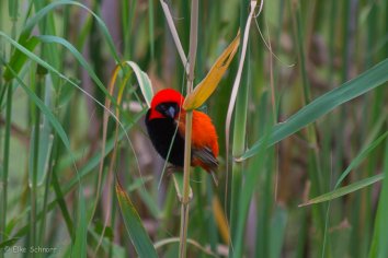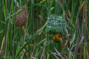 Da die Vögel so faszinierend sind, gehen wir nach dem Frühstück noch für eine Runde in den Bird Hide. Hier können wir eine ganze Weile gut versteckt beobachten, wie die hübschen Kapweber und Oryxweber im Schilf ihre Nester bauen — ein unglaubliches Gezwitscher und Geschwirre: es ist einfach fantastisch so nahe dran zu sein.