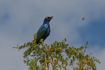 Im Flug sieht er noch viel schöner aus, weil man dann seine farbenfrohen Flügel besser sehen kann, aber da ist er schwer mit dem Fotoapparat einzufangen.