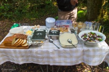 Als wir endlich den höchsten Punkt erreicht haben, werden wir mit einem Lunch für unsere Anstrengungen belohnt: Die Guides bauen ein wunderbares Picknick für uns auf, bei dem selbst eine Tischdecke mitten im Wald nicht fehlt ![]()