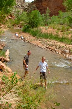 Im Capitol Reef Park kommen wir dann schließlich gegen 14:00 Uhr an. Hier erwartet uns eine völlig andere Landschaft als in den Tagen zuvor. Es gibt wieder viel Grün, Bäume — und sogar einen Fluss: den Freemont River.