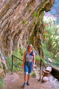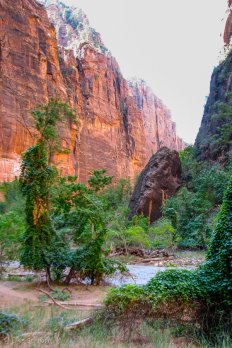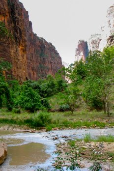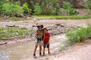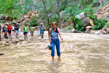 Nach dem Frühstück im Café nebenan fahren wir mit dem Park-Shuttle bis zum nördlichsten Punkt — dem „Temple of Sinawawa“. Hier wandern wir auf dem Riverside Walk — ein wunderschöner Weg entlang des Virgin River, den wir unterwegs auch zweimal durchwaten müssen.