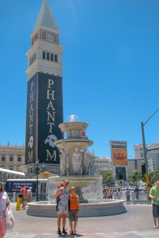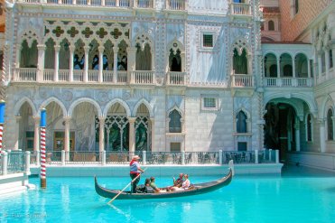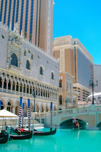 Danach schauen wir uns „Venedig in der Wüste“ an: Am Venetian wurden u.a. der Campanile, der Dogen-Palast und die Rialto-Brücke nachgebaut und natürlich kann man Gondel fahren mit original italienischem Gesang