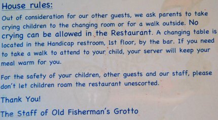 Auch hier wird man überall von Souvenir-Läden, Restaurants und Cafés umworben. Wir landen schließlich im Old Fisherman’s Grotto, wo wir Kokosnuss-Shrimps und Lobster essen. Auf der Speisekarte für Kinder finden wir den folgenden ungewöhnlichen Absatz über die Hausregeln: