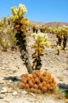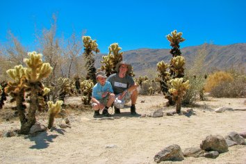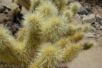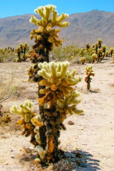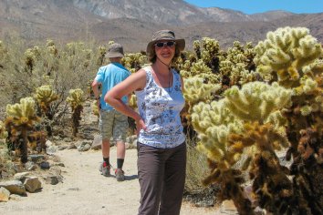 Seinen Namen hat er von den Joshua Trees, aber es gibt auch Palmenhaine, Sanddünen und Kakteengärten. Besonders interessant finden wir die Cholla-Kakteen, die aussehen wie borstige Teddybären.