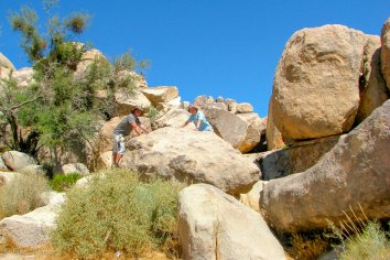 Es soll im Park auch eine große Vielfalt an Wüstenbewohnern geben — sogar Schildkröten. Wir bekommen davon zumindest einen Fuchs und einen Hasen zu sehen… Außerdem gibt es im Park riesige Granit-Monolithen, auf denen Christi und Andreas ihre Kletterkünste erproben.