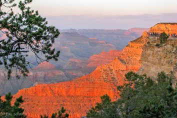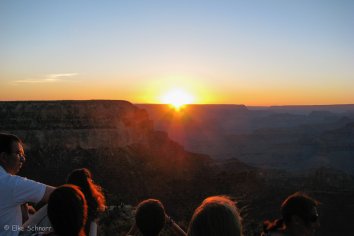 Wieder zurück im Park fahren wir am Abend dann noch einmal zum Yavapai Point, um den Sonnenuntergang zu beobachten. Offenbar sind wir nicht die einzigen mit dieser Idee — denn es haben sich etliche Leute hier versammelt.
