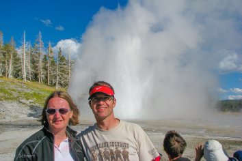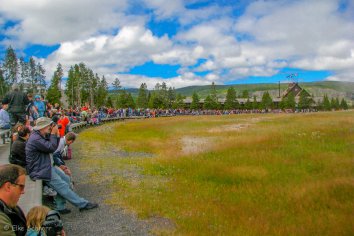 Wir starten natürlich mit Old Faithful — dem Wahrzeichen des Parks. Der „alte Getreue“ katapultiert etwa alle 90 Minuten bis zu 32.000 Liter heißes Wasser bis zu 50 Meter hoch in die Luft und bereits eine halbe Stunde vor der vorhergesagten Eruption versammeln sich die Leute auf den Sitzreihen davor und warten gespannt auf den Ausbruch.